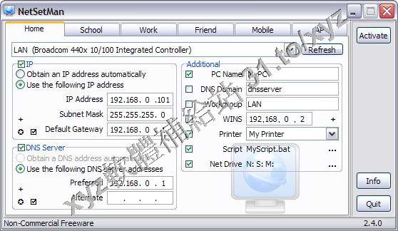 • NetSetMan 3.4.0 Portable 英文正式版(設定電腦ip位址、子網遮罩、預設網關、dns、電腦名、dns 欄位、工作組、wins、列印機等)